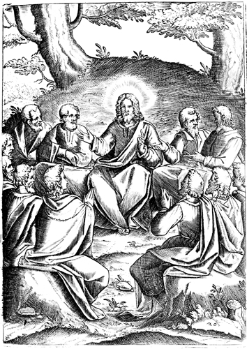 Description: Jesus teaches his disciples in a pastoral setting. The plate is number 20 in a series (lower right).