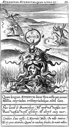 Description: A woman sits among flames in the mouth of a lion, on the head of which sits a demon holding a banner, encircled by a snake, which bears the word "Eternity." In the background, to the left and to the right, two women are tormented by demons bearing whips. The Latin superscription reads, "Eternity, eternity; how long you are!" and the text below, "How long will eternity last? By chance for a thousand years? Thousands, myriad and thrice myriad, they are nothing.".