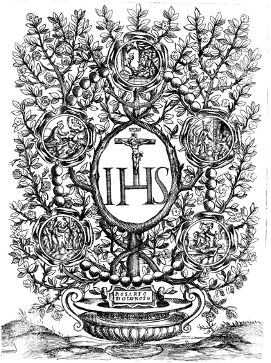 Description: The sorrowful mysteries of the rosary (rosario doloroso) are illustrated in this rose bush that grows about the figure of the crucified Jesus and features scenes from his life (counter-clockwise): washing the disciples’ feet, agony in the garden, betrayal by Judas, nailing to the cross, and the harrowing of Hell. The more typical list of five elements consists of the agony in the garden, scourging at the pillar, crowning with thorns, carrying of the cross, and the crucifixion.