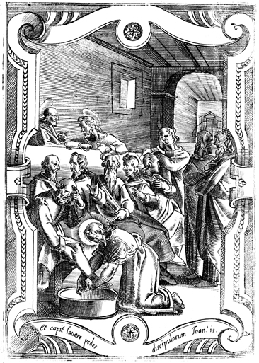 Description: Jesus washes the feet of his disciples, beginning with Peter, and at the base is a quotation of the Vulgate of John 13:5 (“and he began to wash the feet of his disciples”). The plate is number 24 in a series (lower right).