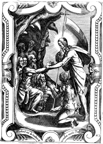 Description: Jesus is shown harrowing hell, or releasing the captives of death. At the base is a citation of the Vulgate of Psalm 107:14 (Vulgate, Psalm 106; “He brought them from darkness and the shadow of death”). The plate is number 42 in a series (lower right), and the artist’s monogram (AB) is at the lower right as well.
