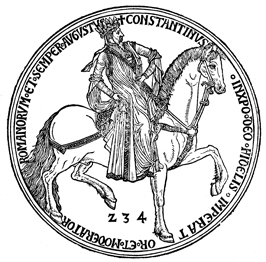 Description: The Medal of Constantine (obverse) shows Constantine I, also known as Constantine the Great, Roman Emperor (r. 306-337) and Consul of the Roman Empire (r. 307, 309, 312-313, 315, 319-320, 326, & 329) on horseback and the inscription, Constantinus Inxro Deo Fidelis Imperator et Moderator Romanorum et Semper Augustus (Constantine, faithful in Christ our God, emperor and ruler of the Romans and forever exalted). See, Craig Barclay, “Byzantium and the Origins of the Renaissance Medal” (http://www.new-byzantium.org/Pisano.html ).