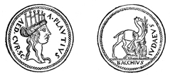 Description: Coin (55 BCE) celebrating A. Plautius, a commander of Pompey’s army, when it captured Aristobulus II (63 BCE). The head of Cybele is on the obverse, and the figure of Bacchius beside a camel on the reverse.