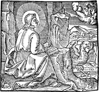Description: John writes the book of Revelation with his attribute, the eagle, nearby.