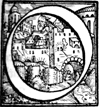 Description: An initial letter O with a city.