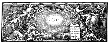 Description: God, represented by an illuminated cloud bearing the Tetragrammaton, sends an angel to prevent Abraham from sacrificing his son Isaac, providing a ram for him instead (left), and provides Moses with the Ten Commandments (right).