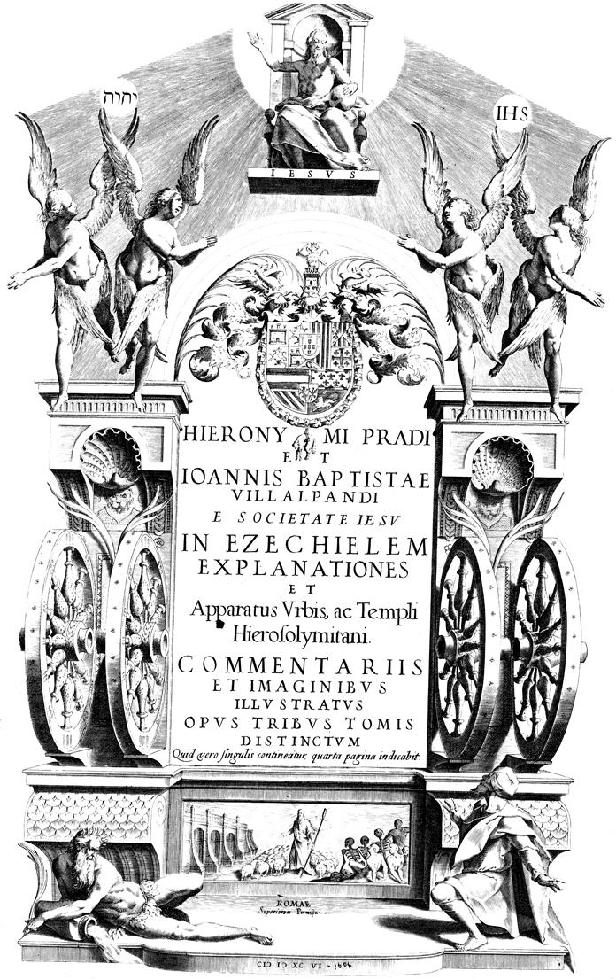 Description: This historiated title-page border consists of Jesus enthroned and holding an orb (top). Below the throne is the coat of arms of King Philip II of Spain (r. 1554-1598), with the collar for the Order of the Golden Fleece, a chivalric order, around the arms. On both sides of the arms are angels, with the Tetragrammaton (left) and Christogram IHS (right) above them. On either side of the title are pairs of breaking wheels, also known as a Catherine wheel, after Saint Catherine of Alexandria. Below the title is a scene portraying Jesus as the Good Shepherd.