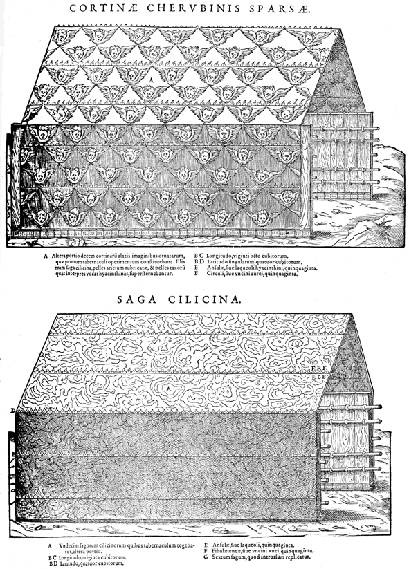 Description: Curtains for the tabernacle, made with fine linen and blue, purple, and scarlet yarn. The top image is of the inner curtain and is embroidered in cherubim. The bottom image is of the outer curtain.