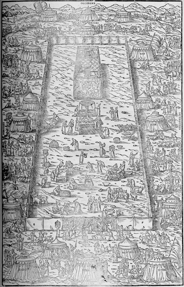 Description: The twelve tribes of Israel encamped in proper locations around the tabernacle with view of interior court.