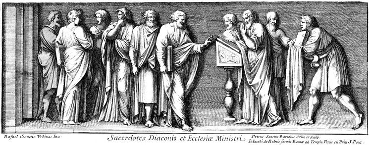 Description: This image depicts priests, deacons and church officials engaging in conversation. By Pietro Santi Bartoli (1635-1700) after Raphael (1483-1520), published by Giovanni Giacomo de Rossi (1627-1691). The text says "Priests, Deacons and Church Officials".