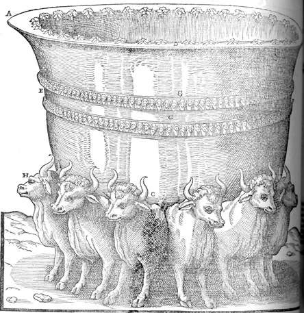 Description: The bronze sea made by Solomon for the temple, including the twelve cast oxen supporting the sea, with three each facing north, south, east, and west.