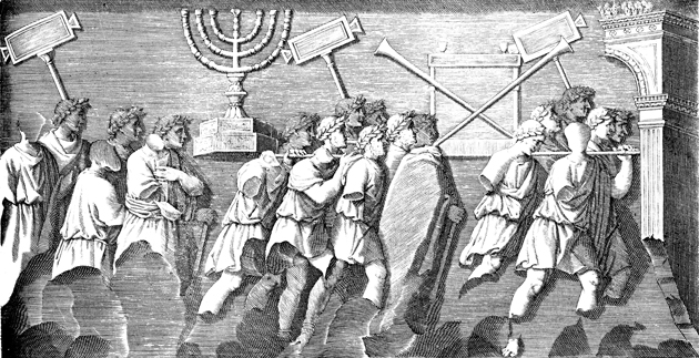 Description: An image showing the destruction of the temple after the fall of Jerusalem, and the subsequent looting, with the temple’s treasures being taken back to Rome. This image is taken from the inside wall of the Arch of Titus in Rome.