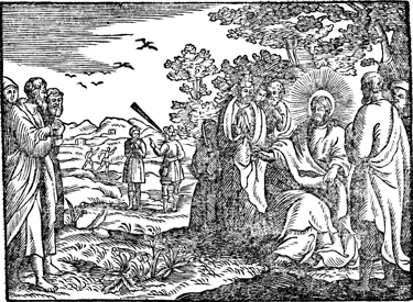 Description: Jesus tells his disciples that a person with a plank in their eye should not judge another with a speck in their eye, as the action takes place.