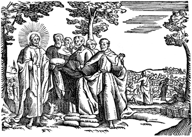 Description: Jesus feeds the 4,000 with seven loaves of bread and a few small fish. Afterwards, seven baskets of leftovers are collected.