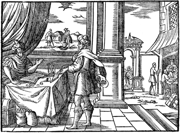 Description: The rich man fires the dishonest steward and demands a report on his accounts. In the rear, the dishonest steward adjusts his accounts.