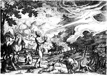 Description: Adam stand before the glory of the Lord, as represented by a radiating light enclosed around the Tetragrammaton, while in the background Eve stands before the glory of the Lord after being created out of Adam’s side.
