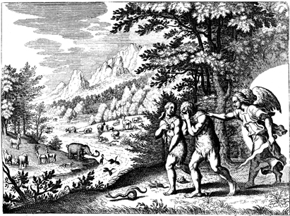 Description: An angel expels a newly clothed Adam and Eve from the Garden of Eden, after they ate the forbidden fruit.