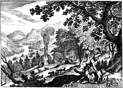 Description: Cain (right) and Abel each present an offering to God, while in the foreground Cain murders Abel in a fit of jealousy after God prefers his brother’s offering to his own.