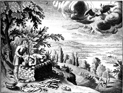 Description: After witnessing Abraham’s faith, an angel prevents him from sacrificing his son Isaac to God and supplies a ram instead for the sacrifice.