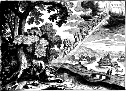Description: God, represented by the Tetragrammaton in the upper right corner, blesses Jacob while he dreams, as angels descend and ascend a ladder connecting heaven and earth.