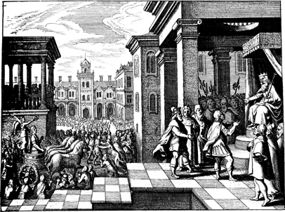 Description: After interpreting Pharaoh’s dreams, Joseph is promoted to vice-regent in Egypt, and given Pharaoh’s chariot with which to ride throughout the land, as the people in the streets praise him (left).