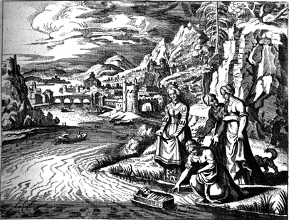 Description: The daughter of Pharaoh finds Moses in a papyrus basket among the reeds along the riverbank.