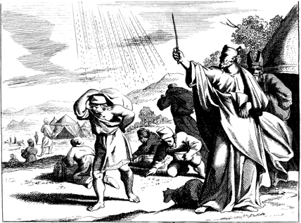 Description: The Israelites gather manna as Moses lifts his staff to the heavens.