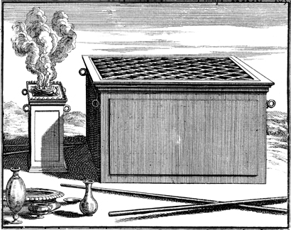Description: A rendering of the altar for the burnt offering (right) and the altar of incense (left) with ritual vessels in the foreground.