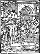 Description: A band of skeletons, representing death, play musical instruments in the cemetery. The 41 images of Hans Holbein's "The Dance of Death" (Lyon, 1538) were cut by Hans Luetzelburger and here appear in the 1542 Latin edition of the work.