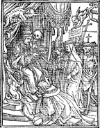 Description: The Pope, wearing the papal triple tiara, crowns a king (the globus cruciger on the ground before him), as cardinals, bishops, skeletons (representing death; one in cardinal's garb), and two flying demons (one with papal decree in hand) look on. The 41 images of Hans Holbein's "The Dance of Death" (Lyon, 1538) were cut by Hans Luetzelburger and here appear in the 1542 Latin edition of the work.