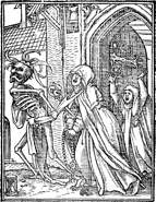 Description: A skeleton (= Death) leads an abbess away. The abbess holds a rosary in her hands and a crosier underneath her arm. In the bottom left-hand corner is an hourglass representing human mortality. The 41 images of Hans Holbein's "The Dance of Death" (Lyon, 1538) were cut by Hans Luetzelburger and here appear in the 1542 Latin edition of the work.