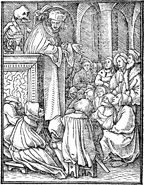 Description: A preacher preaches to his congregation as a skeleton (= Death) taps on his shoulder holding an hourglass. The 41 images of Hans Holbein's "The Dance of Death" (Lyon, 1538) were cut by Hans Luetzelburger and here appear in the 1542 Latin edition of the work.
