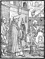 Description: A skeleton (= Death) leads a procession with a priest holding the host in a monstrance. The skeleton rings a bell in his left hand and holds a lantern in his right, while holding an hourglass underneath his arm. The 41 images of Hans Holbein's "The Dance of Death" (Lyon, 1538) were cut by Hans Luetzelburger and here appear in the 1542 Latin edition of the work.