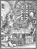 Description: A skeleton (= Death) takes a rich man’s money. The 41 images of Hans Holbein's "The Dance of Death" (Lyon, 1538) were cut by Hans Luetzelburger and here appear in the 1542 Latin edition of the work.