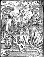 Description: A skeleton (= Death) is executed as a man and woman look on. In the center is an hourglass, the reminder of human mortality. The 41 images of Hans Holbein's "The Dance of Death" (Lyon, 1538) were cut by Hans Luetzelburger and here appear in the 1542 Latin edition of the work.
