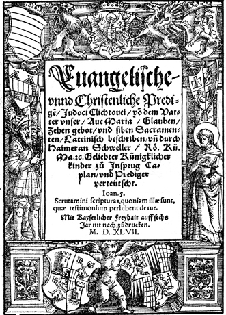 Description: A historiated title-page border features the coat of arms of the Holy Roman Empire at the top, an armed soldier with armor to the left, and the Apostle John to the right, holding his attribute a cup.