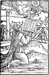 Description: Moses receives the Ten Commandments from God on Mount Sinai as the Israelites worship the golden calf.