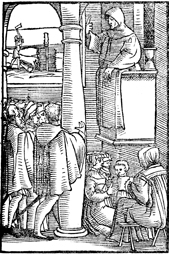 Description: This image depicts a violation of the third commandment: ““Honor the Sabbath, to keep it holy.”” As the congregation is gathered for worship and instruction on Sunday, outside an individual does work.