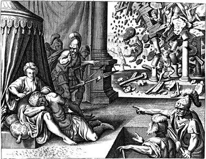 Description: Delilah cuts Samson’s hair, as he sleeps. In the background, Samson pulls down the temple of Gaza.
