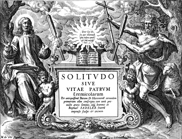 Description: The title-page features Jesus (left) and John the Baptist, the latter with a cross and the lamb (John 1:29) that served as his attributes. The sun in the center preserves the Latin text of John 1:9. The name of the artist (Maarten De Vos) responsible for the design is set in the lower left.