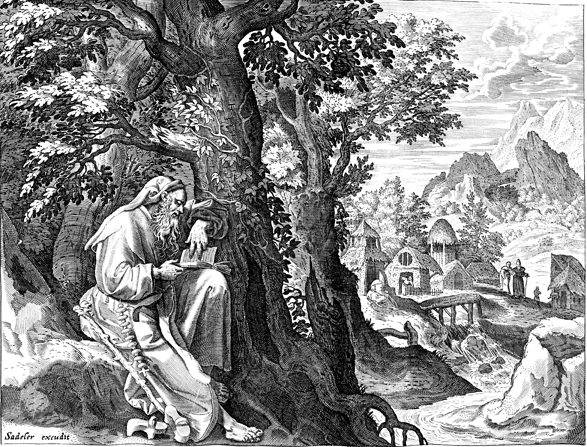 Description: Saint Eulogios, an Egyptian ascetic who lived in the Thebaid area, was noted for showing hospitality to strangers. The artist responsible for the design was Maarten De Vos, but the engraving for the volume was done by Johannes Sadeler I (Jan Sadeler) and Raphael Sadeler I, whose surname is at the lower left.