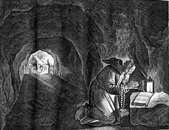 Description: Saint Macarius of Egypt (d. 390), a founder of monasticism and pupil of Saint Anthony, kneels in prayer in a cave. The artist responsible for the design was Maarten De Vos, but the engraving for the volume was done by Johannes Sadeler I (Jan Sadeler) and Raphael Sadeler I, whose surname is at the lower right.