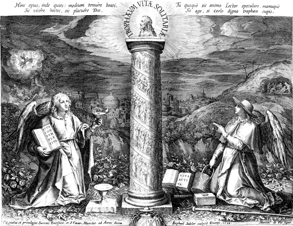 Description: This image comes from Trophaeum Vitae Solitariae, dated 1598, bound with Solitudo, sive, Vitae patrum eremicolarum. A title-page featuring two angelic figures kneeling before a column. Jerusalem is in the background and Golgotha to the right, and at the base of the column is the cardinal’s crest.
