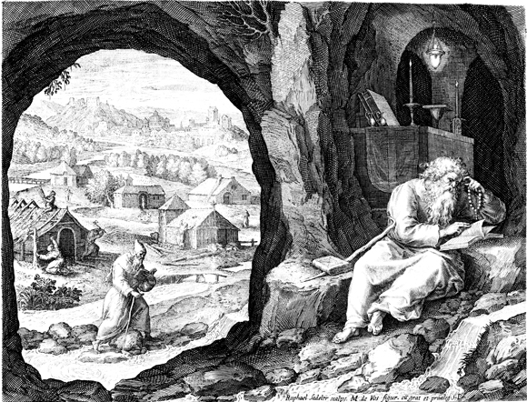 Description: This image comes from “Trophaeum Vitae Solitariae,” dated 1598, bound with “Solitudo, sive, Vitae patrum eremicolarum”. Saints Euthymius the Great (377–473) and Theoctistus (died 451), both hermits, are shown living in a cavern in the wilderness, while in the background figures are building a structure. The artist responsible for the design was Maarten De Vos and the engraver was Johannes Sadeler I (Jan Sadeler), whose names are at the lower right.