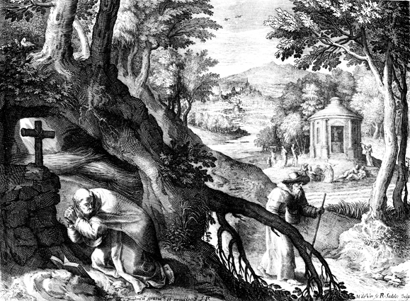 Description: This image comes from “Trophaeum Vitae Solitariae,” dated 1598, bound with “Solitudo, sive, Vitae patrum eremicolarum”. Saint Paternus, the fifth century Welsh hermit, is shown kneeling before a cross in the woods. The artist responsible for the design was Maarten De Vos, but the engraving for the volume was done by Raphael Sadeler I, whose names are at the base.