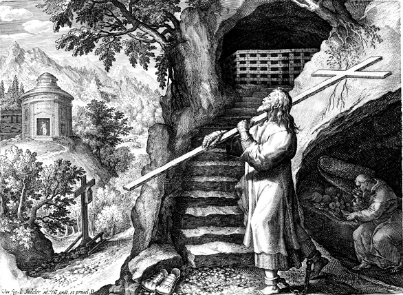 Description: This image comes from “Trophaeum Vitae Solitariae,” dated 1598, bound with “Solitudo, sive, Vitae patrum eremicolarum”. Saint Theodore the Studite (759-826) was a Byzantine Greek monk. His letter suggesting monastery reform rules is one of the first recorded stands against slavery. Here, he appears in chains, carrying a cross. The artist responsible for the design was Maarten De Vos and the engraver, Johannes Sadeler I (Jan Sadeler), whose names are at lower left.