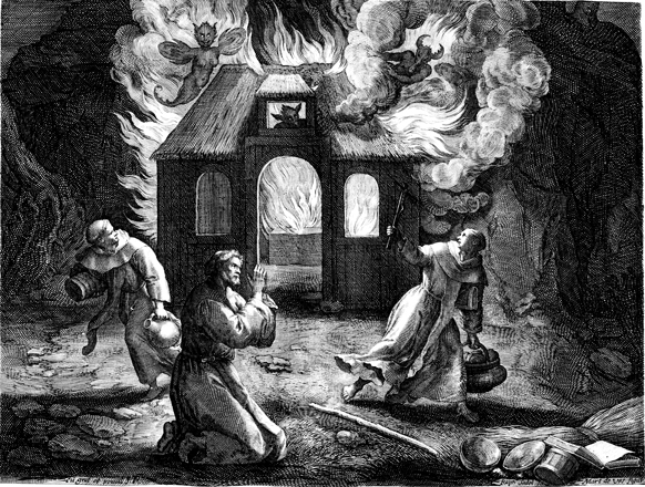 Description: This image comes from “Trophaeum Vitae Solitariae,” dated 1598, bound with “Solitudo, sive, Vitae patrum eremicolarum”. Pope Saint Celestine V (r. 1294) praying in front of a burning house, as the other monks flee their home and devils gather in the fire. The artist responsible for the design was Maarten De Vos, but the engraving for the volume was done by Raphael Sadeler I, whose names are at the base.