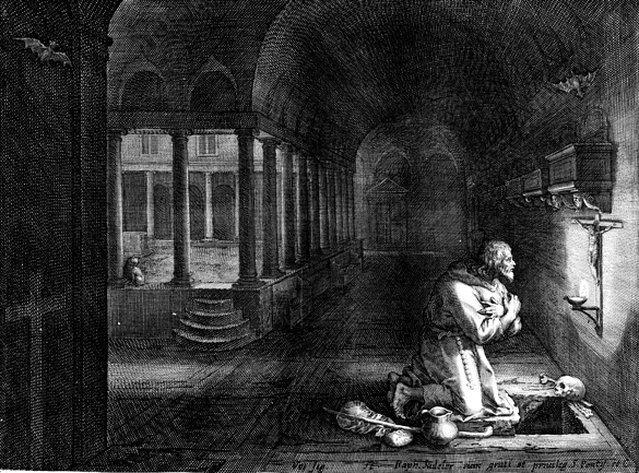 Description: This image comes from “Trophaeum Vitae Solitariae,” dated 1598, bound with “Solitudo, sive, Vitae patrum eremicolarum”. Saint Paul kneels in a sepulcher before a crucifix. The artist responsible for the design was Maarten De Vos, but the engraving for the volume was done by Raphael Sadeler I, whose names are at the base.