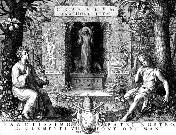 Description: This image comes from “Oraculum Anachoreticum,” dated 1600, bound with “Solitudo, sive, Vitae patrum eremicolarum”. A historiated title-page featuring a statue of Jesus as the Good Shepherd (center), with the figures of Obedience (Abraham stayed from sacrificing Isaac, left) and Humility on either side. At the bottom of the page is the coat of arms of Pope Clement VIII (r. 1592-1605). The artist responsible for the design was Maarten De Vos and the engraver was Johannes Sadeler I (Jan Sadeler), whose names are at the lower right.