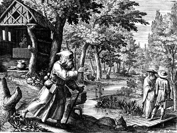 Description: This image comes from “Oraculum Anachoreticum,” dated 1600, bound with “Solitudo, sive, Vitae patrum eremicolarum”. St Ephaestio throwing a bag of coins into a stream with a chapel at left. The names of the artist responsible for the design, Maarten De Vos, and the engraver, Johannes Sadeler I (Jan Sadeler), are at the lower right.